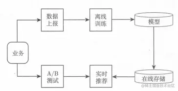 如下图所示, 一个典型的基于离线训练的推荐系统架构由数据上报、离线训练、在线存储、实时计算和 A/B 测试这几个模块组成。其中,数据上报和离线训练组成了监督学习中的学习系统,而实时计算和 A/B 测试组成了预测系统。另外,除了模型之外,还有一个在线存储模块,用于存储模型和模型需要的特征信息供实时计算模块调用。图中的各个模块组成了训练和预测两条数据流,训练的数据流搜集业务的数据最后生成模型存储于在线存储模块;预测的数据流接受业务的预测请求,通过 A/B 测试模块访问实时计算模块获取预测结果。