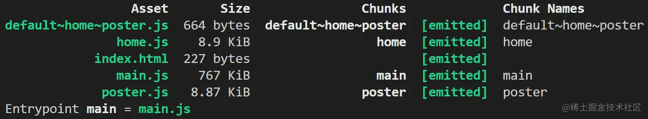 同步引入的模块不会被打包出来。所以第(1)部分没有打包出来,包含在main.js中。第(3)部分的内容被抽离到了default ~ home~poster.js中,home.js和poster.js中没有第(3)部分的内容。