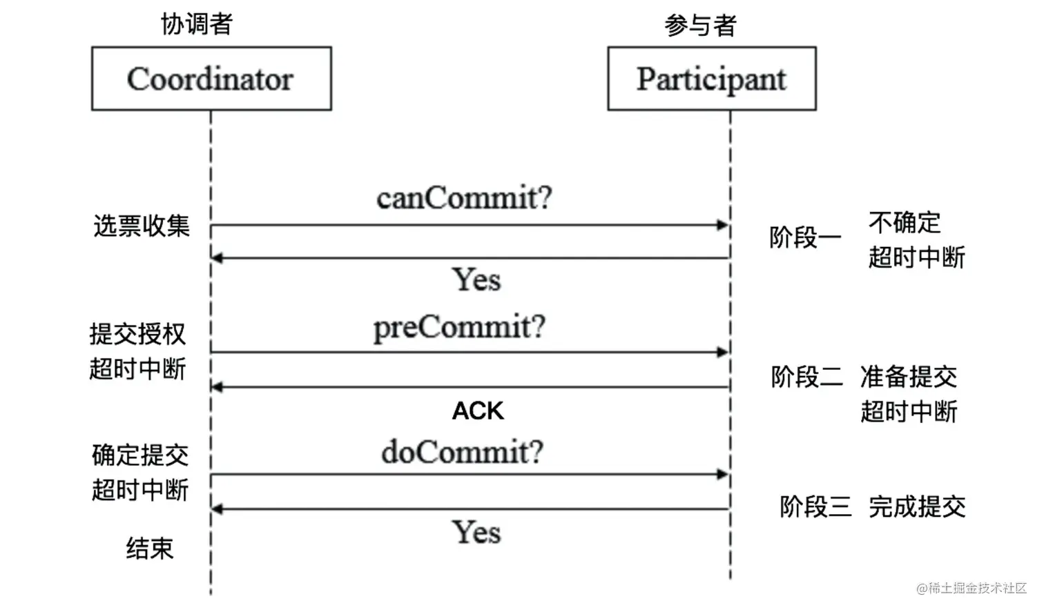 参与者在事务完成后,向协调者反馈Ack信息。- 中断事务