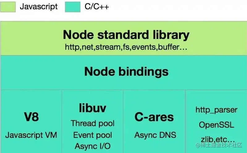 最底层是支撑 Node.js 运行的关键,由 C/C++ 实现。