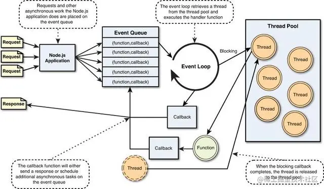 主线程代码执行完毕完成后,然后通过Event Loop,也就是事件循环机制,开始到Event Queue的开头取出第一个事件,从线程池中分配一个线程去执行这个事件,接下来继续取出第二个事件,再从线程池中分配一个线程去执行,然后第三个,第四个。主线程不断的检查事件队列中是否有未执行的事件,直到事件队列中所有事件都执行完了,此后每当有新的事件加入到事件队列中,都会通知主线程按顺序取出交EventLoop处理。当有事件执行完毕后,会通知主线程,主线程执行回调,线程归还给线程池。
