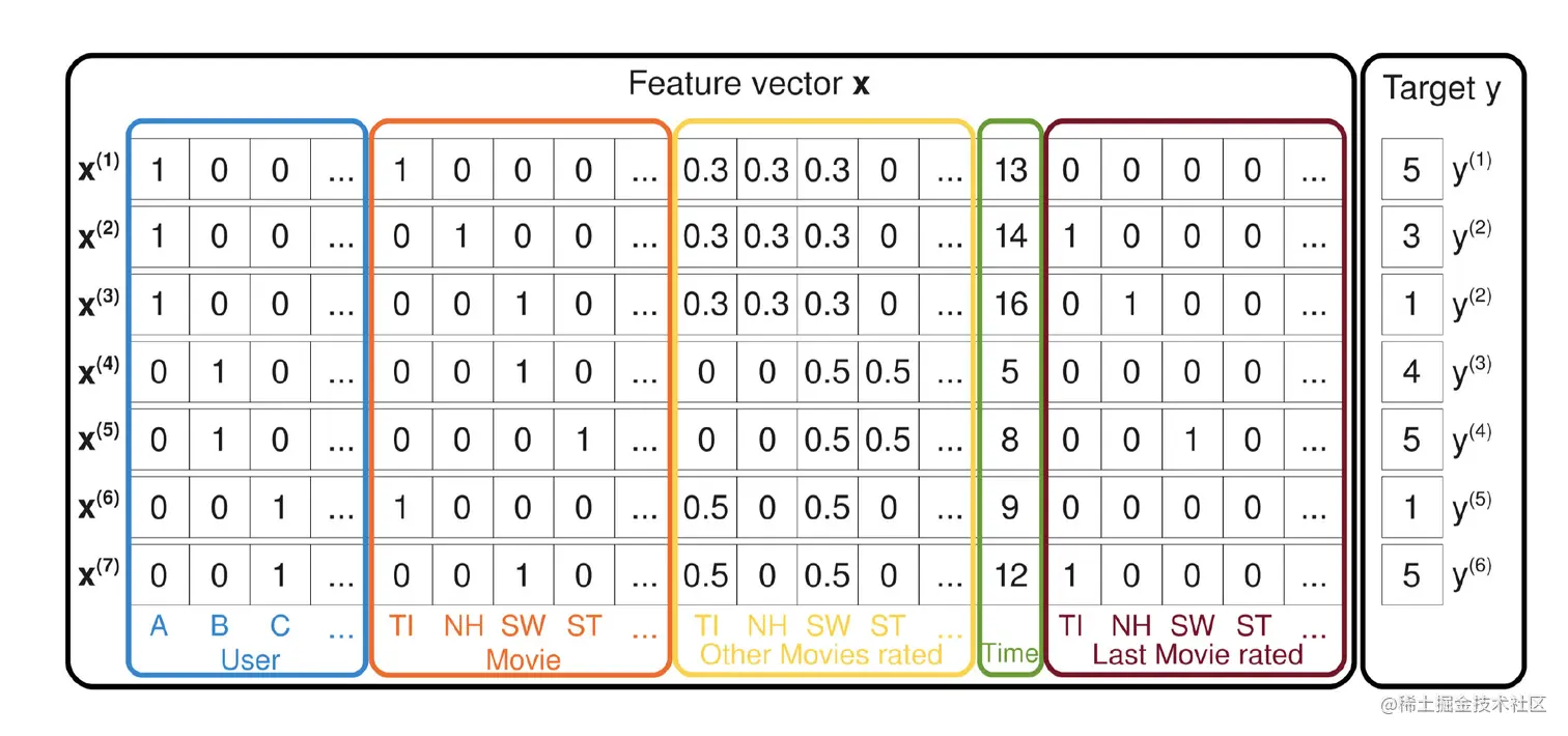 很明显上图的左边一大块是特征,右边的Target y表示的预测结果,也就是用户可能对电影做出的评价。这里一共有[1, 2, 3, 4, 5]这5种可能,也就是说这是一个多分类的问题。