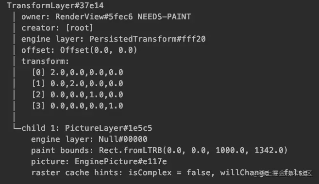 我们知道 flutter 中真正负责绘制的工作是由 renderobject 完成的,那么最后绘制到哪里去了,显然是 layer tree 了。在调试 APP 的过程中 我们可以通过 debugDumpLayerTree()方法,在控制台打印信息,查看最后生成的 layer tree。