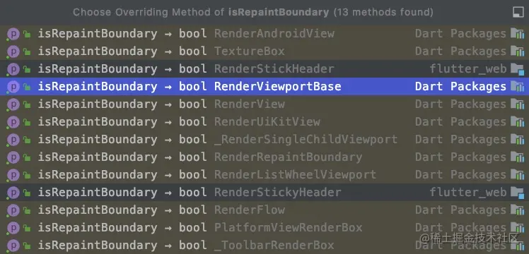 这个张图显示了一些重写了 isRepaintBoundary 的RenderObject,isRepaintBoundary 的默认值是 false,重写当然就是返回 true 了。所以我们的 RenderViewPort 是一个“重绘边界”。