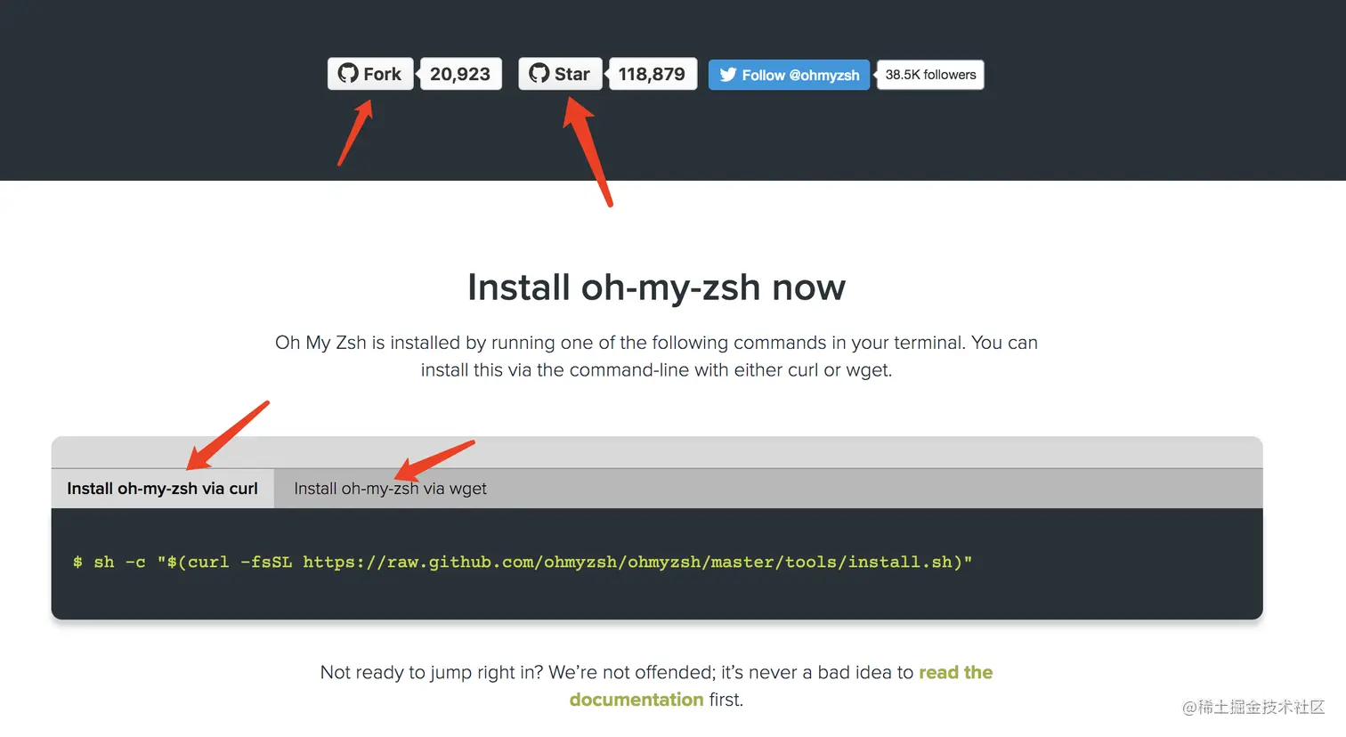 在官网中点击按钮「Install oh-my-zsh」,就可以看到如何安装了。