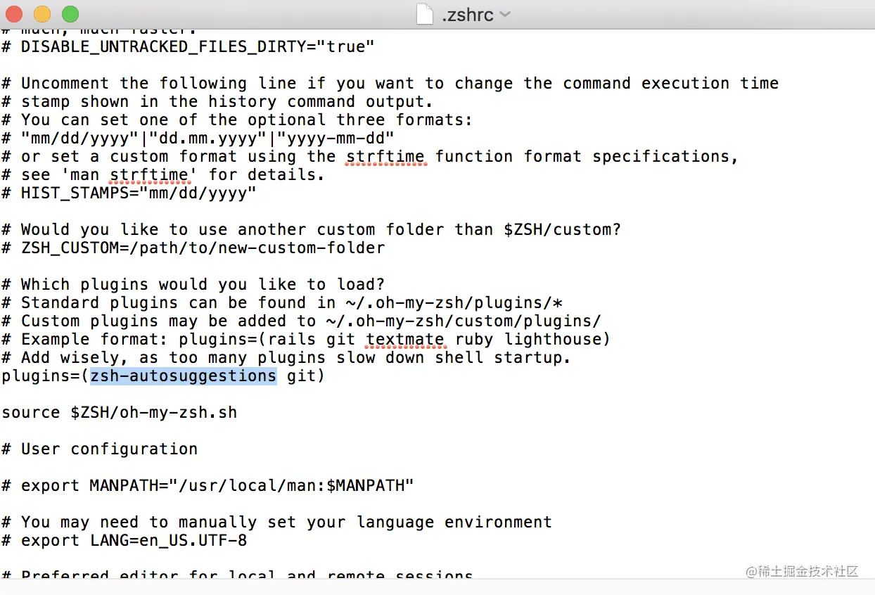 当然你也可以直接打开 .zshrc 这个文件,找到 plugins 把 zsh-autosuggestions 加上。