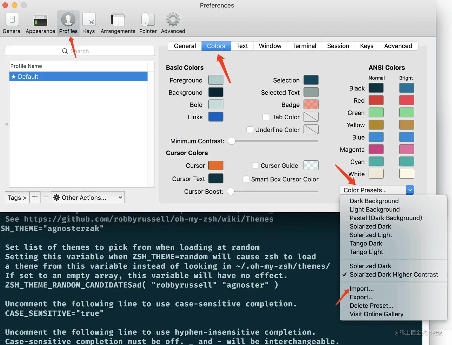 大家可以根据个人的喜好选自己喜欢的色彩主题,然后在 iterm2 中选择 Preference -> Profiles -> Colors ,导入色彩主题,并勾上就可以。