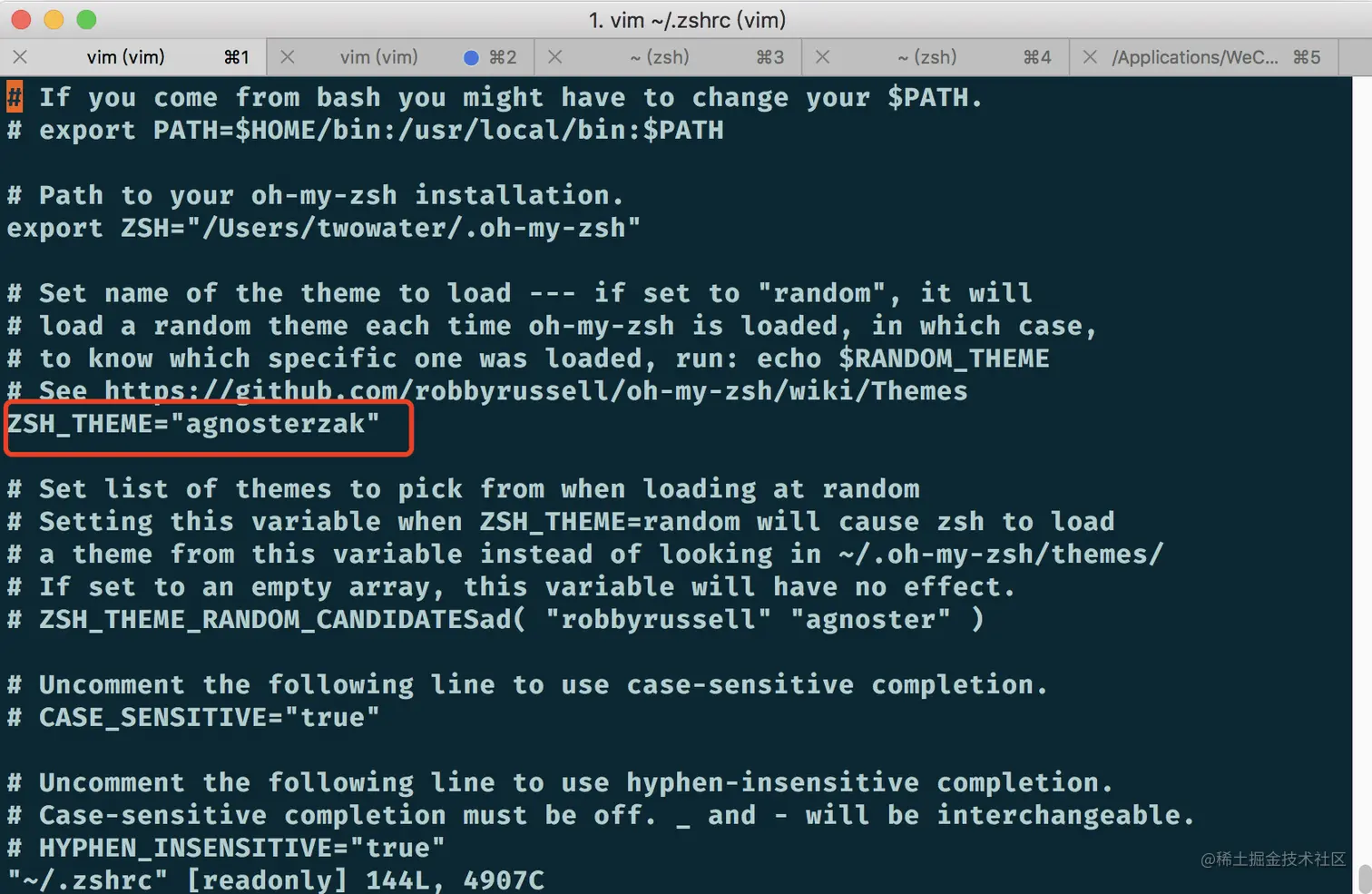 当然,你不太熟悉上面的操作,可以直接打开 .zshrc 的文件,然后用普通的编辑器直接修改那个 ZSH_THEME 的值,最后保存就好。