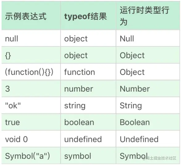 事实上,“类型”在 JavaScript 中是一个有争议的概念。一方面,标准中规定了运行时数据类型; 另一方面,JS语言中提供了 typeof 这样的运算,用来返回操作数的类型,但 typeof 的运算结果,与运行时类型的规定有很多不一致的地方。我们可以看下表来对照一下。
