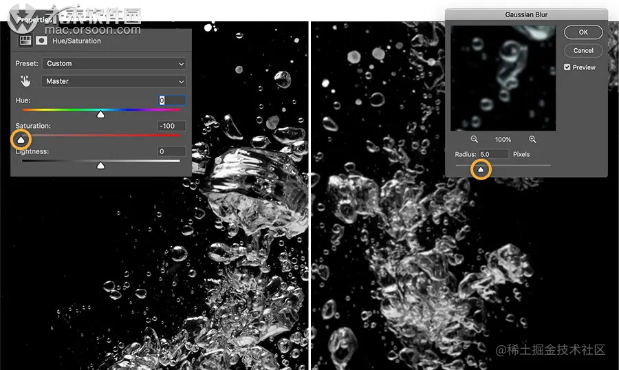 首先通过应用色相/饱和度调整层创建气泡的位移图。在将文件另存为新的Photoshop文档之前,Lukianova对图像进行了去饱和处理并应用了高斯模糊。