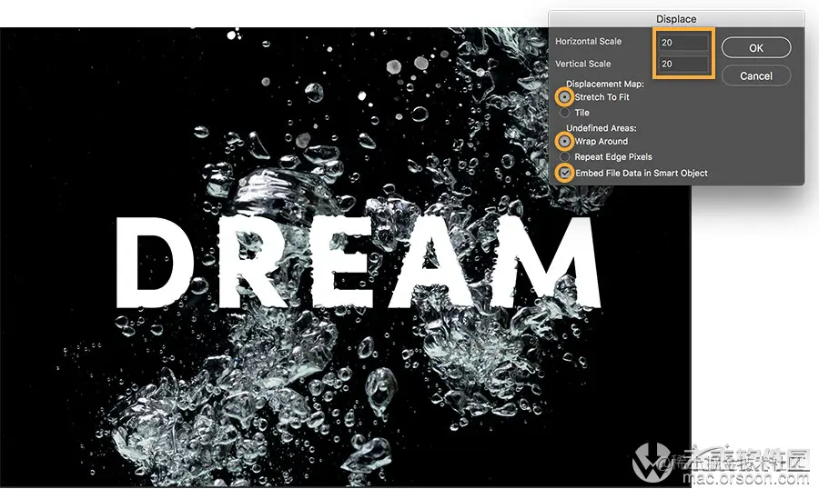 要在气泡周围形成文本,请应用“置换”滤镜(“滤镜”>“扭曲”>“置换”),并调整设置以获得所需的效果。接下来,在出现提示时,选择之前保存的Photoshop文档,以用作置换贴图。