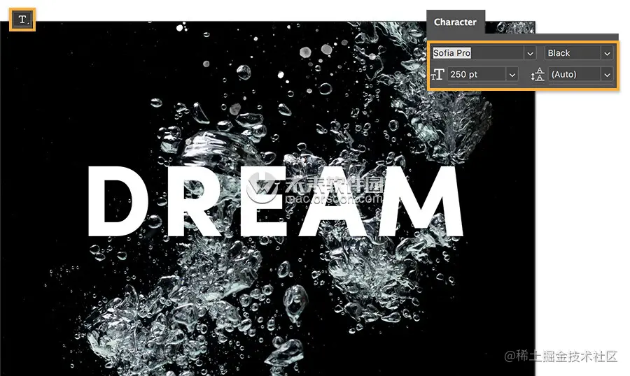 回到原始的水图像中,Lukianova键入了单词DREAM并将文本层转换为智能对象。