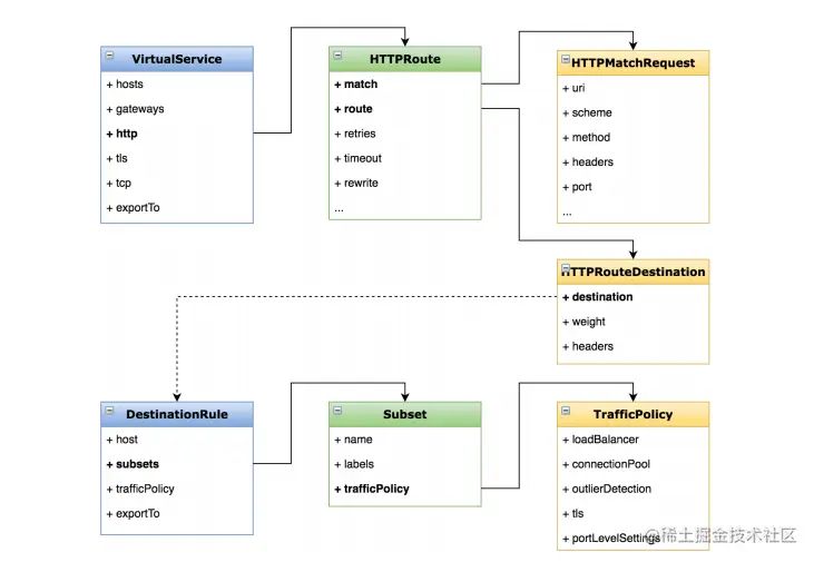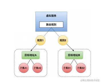 首先从虚拟服务和目标规则讲起,他们一般来说都是一起被使用的,虚拟服务来定义路由规则和描述满足条件的请求去哪里,而目标规则则是定义子集和策略,描述到达目标的请求该怎么处理,以图为例。