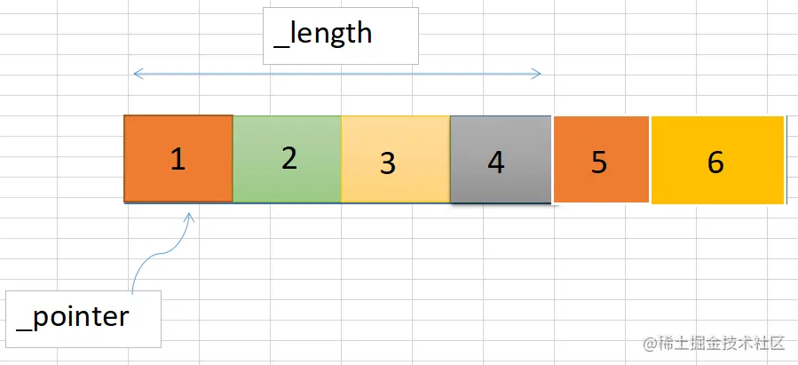 上面代码的 ref struct 可以看出,这个 Span 是只可以分配在栈上的值类型,然后就是里面的 _pointer 和 _length 两个实例字段,不知道看完这两个字段脑子里是不是有一幅图,大概是这样的。
