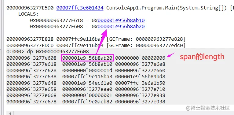 span 是由 _pointer + length 组成的,刚才的 _pointer 也给大家演示了,那 length 的值在哪里呢? 因为 span 是 struct,所以需要用 dp 把刚才的线程栈最小的栈地址打出来就可以了。