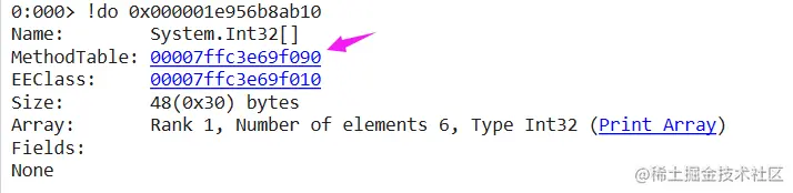 可以看出,第一排为: 00007ffc3e69f090 0000000000000006, 前面的 8 byte 表示 数组 的 方法表地址,后面的 8byte 表示 6 ,也就是说数组有 6个元素,不信的话我截一张图: