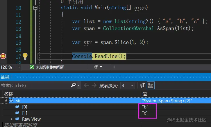 平时用 Span 的时候,更多的会应用到 Array 上面,毕竟 Array 在托管堆上是连续内存,方便 Span 在上面画一个可视窗口,其实不仅仅是 Array,从 .NET5 开始在 List 上画一个视图也是可以的,截图如下: