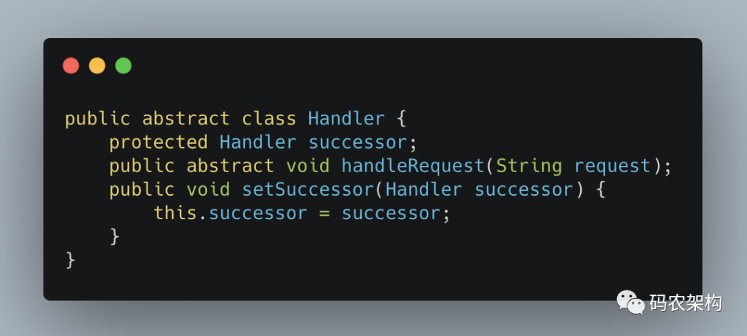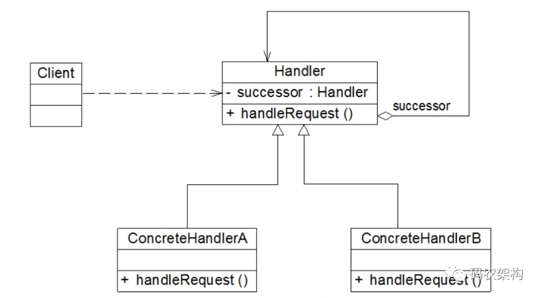 Handler(抽象处理者):所有具体处理者的父类,一般定义为抽象类,定义了一个统一的处理入口,以及维持了一个抽象处理者类型对象的引用,用于形成链式处理者
