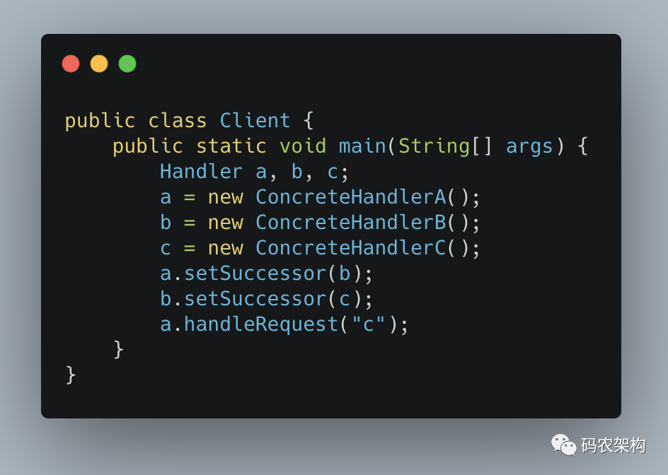 ConcreteHandler(具体处理者):继承抽象处理者,实现统一的处理入口,将自己无法处理的请求转发给下一个处理者