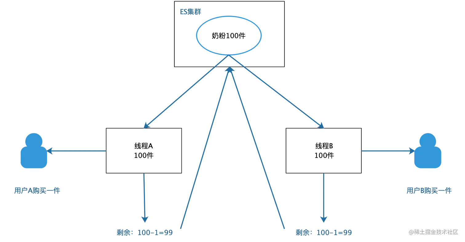 当用户A购买商品后 库存-1,此时商品库存为99。这个时候用户B也提交了订单,只是用户B线程携带的数据库存为100件。乐观锁状态下,用户B会去校验 ES 中的的这条数据版本号和自身的是否一致,如果不一致,则不会提交,会重新去 ES 中获取最新的数据 99 件,再次减一,变为 98。再执行上述流程就可以写入。