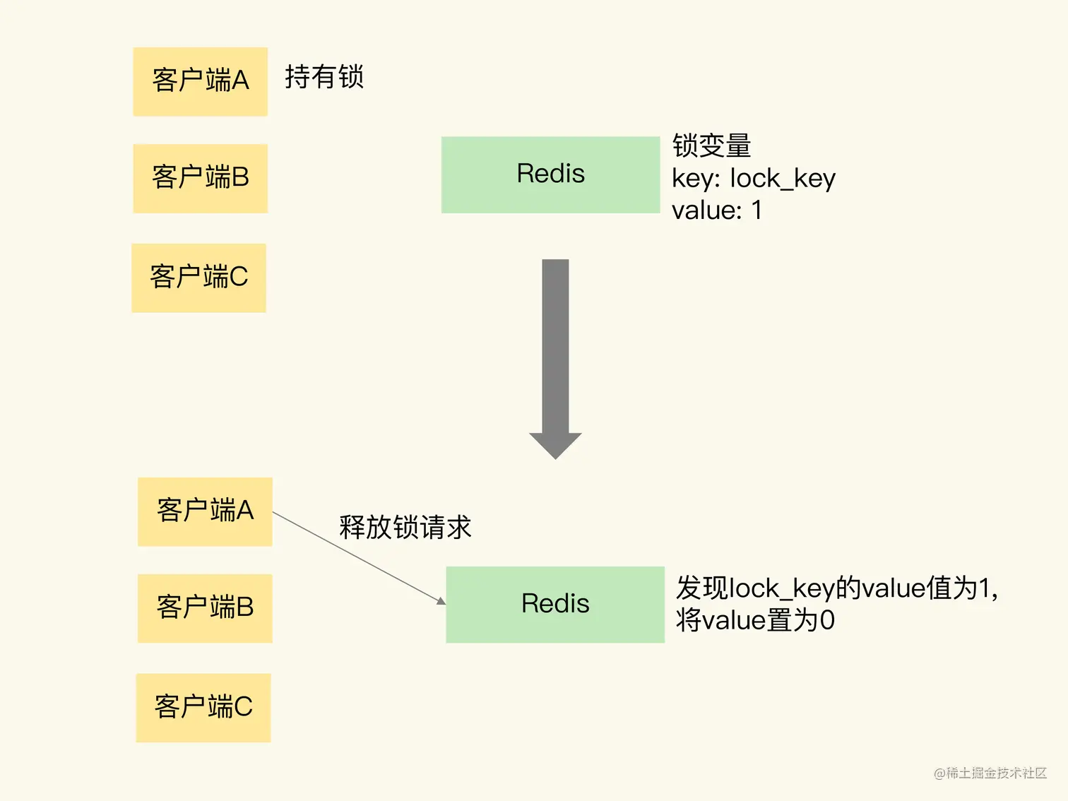 我还是借助一张图片来解释一下。这张图片展示了客户端A请求释放锁的过程。当客户端A持有锁时,锁变量lock_key的值为1。客户端A执行释放锁操作后,Redis将lock_key的值置为0,表明已经没有客户端持有锁了。