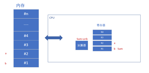 也就是需要读取数据a和b,那么读取到的数据a和b存放在哪了呢?根据我们上面对CPU简单的了解可知,数据a和b是被放到了CPU中的寄存器中了,看这个图