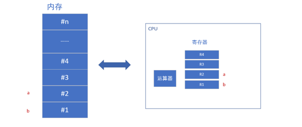 在CPU中有两个比较重要的组件就是运算器和寄存器,寄存器有很多个,再看内存,是一个个的小格子,每个格子有编号,比如说现在数据a和b分别存放在#1和#2上,然后CPU将他们读取放在寄存器R1和R2上
