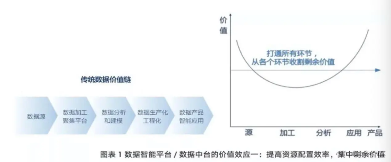 由于大量开源工具,数据的加工与分析算法的趋同使这两个环节的附加值不断降低,而数据的供给和最后的应用、产品解决方案则会成为附加值最高处。数据智能平台打通了数据价值链上的各个环节,让处在不同生命周期的行为发生应该发生的地方,提高资源配置效率,通过平台汇聚和沉淀,将剩余价值集中在平台上。