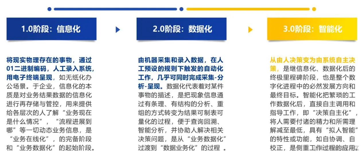 在数字化转型过程中,企业会经历三个里程碑,即:1.0信息化阶段、2.0数据化阶段、3.0智能化阶段。信息化阶段与数据化阶段最大的区别是信息由谁录入,数据化和智能化的最大区别是决策由谁来做。3.0智能化阶段是企业数字化目前最关键也最重要的阶段,是实现数据业务化的关键。