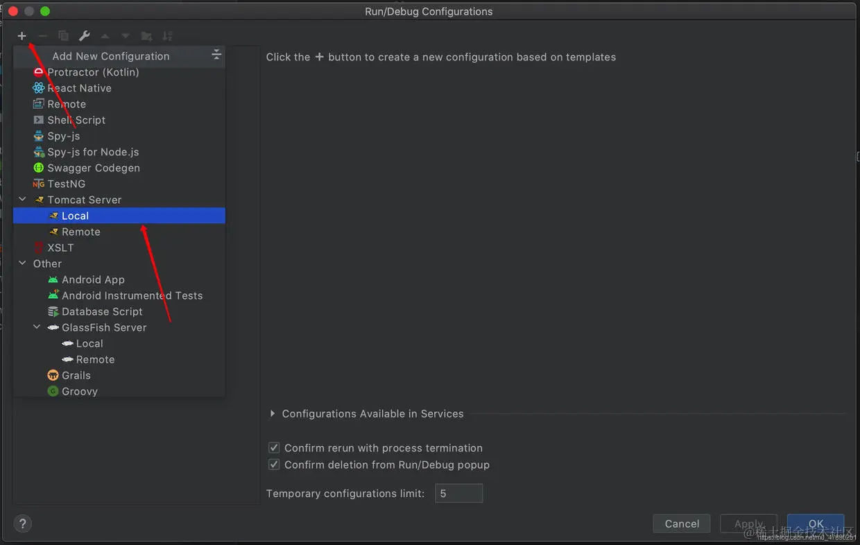 步骤2:点击左上方+,选择Tomcat Server下的Local。