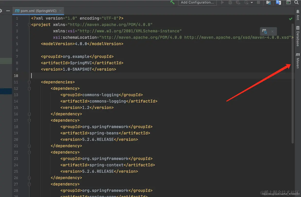 提示: 导入依赖Jar包后,需要点击右侧的Maven,然后刷新一下才能生效。具体如下: