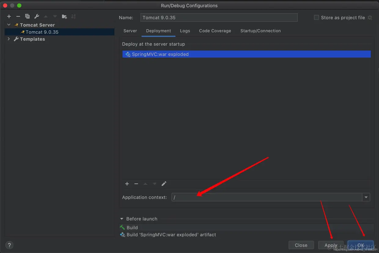 步骤3:点击右下角的Fix。修改Application context为/,接着点击Apply->OK。