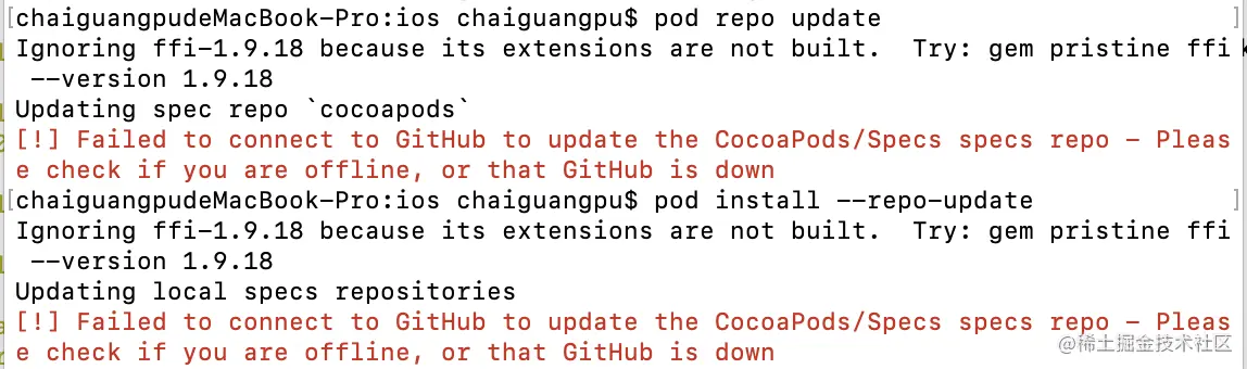 [!] Unable to find a specification for ”xxx“ 你好William 2020-11-13 746 阅读1分钟 flutter项目 在运行ios包的时候需要pod install 然后报错如图 按照提示执行pod repo update和pod install --repo-update 执行结果如下图 解决方法 尝试更新ruby到最新版本,看看是否能解决 执行命令 brew upgrade ruby 然后再 pod install 问题解决