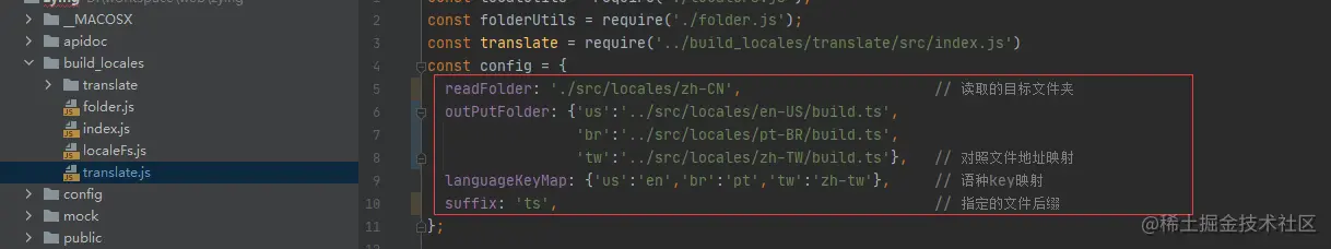 const config = { readFolder: './src/locales/zh-CN', suffix: 'ts', outPutFolder: {'us':'../src/locales/en-US/build.ts', 'br':'../src/locales/pt-BR/build.ts', 'tw':'../src/locales/zh-TW/build.ts'}, languageKeyMap: {'us':'en','br':'pt','tw':'zh-tw'}, };配置说明: