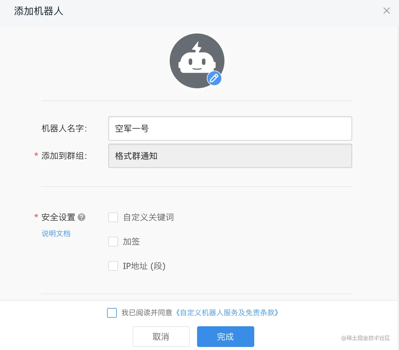- 添加自定义机器人,有三种安全设置可以选择,示例中选择的是自定义关键词