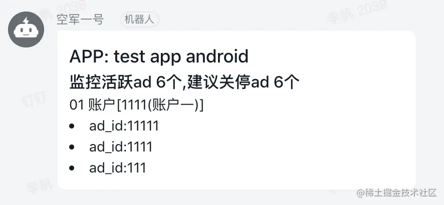 const axios = require('axios');async function sendMsg() { try { await axios.post('webhook_url', { msgtype: "markdown", markdown: { "title": "[notice][cruiser-v2]智能辅助决策通知", "text": "## APP: test app android \n ### 监控活跃ad 6个,建议关停ad 6个 \n #### 01 账户[1111(账户一)] \n - ad_id:11111 \n - ad_id:1111 \n - ad_id:111" }, }); } catch (error) { console.log(error) }}(async () => { await sendMsg();})()