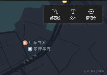近期在地图类的项目上有一个需求,需要在地图上完成多种标记,线,文本的绘制,类似官方示例在地图上浮动一个工具栏,点击工具栏后可以切换当前的激活类型,然后点击地图后即可以自动生成所需的内容,工具栏如下图所示