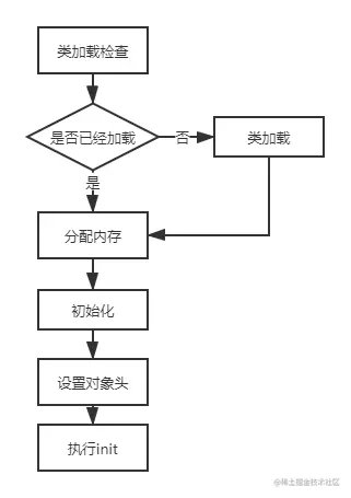 - 虚拟机在接收到一条new 指令时,会先检查对象是否被加载到内存中,如果没有进入类加载流程