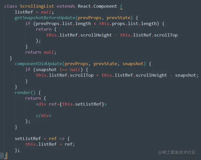 它的返回值作为第三个参数传递给后面的componentDidUpdate 参数中,和commentDidUpdate 一起使用,能够覆盖commentWillUpdate 的所有使用场景,