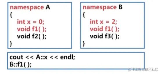 //可以在此处加 using namespace A; using namespace B; 则访问x不用加A::。