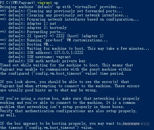 如果启动发现 vagrant up 命令超时,一种可能原因是需要密码登录。