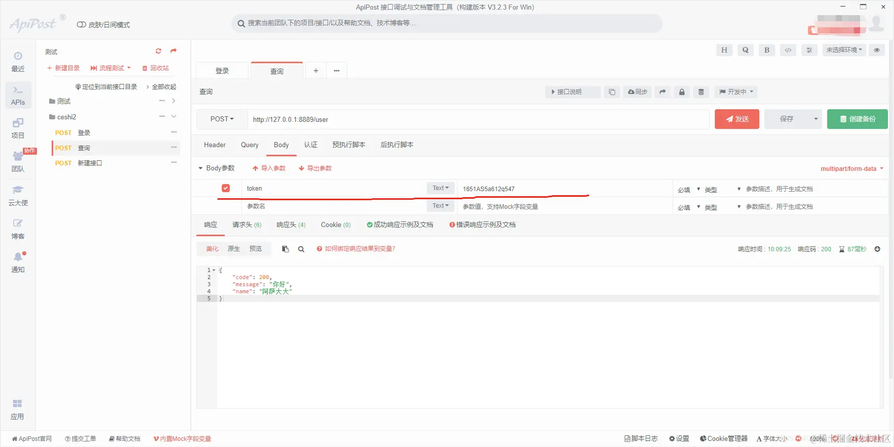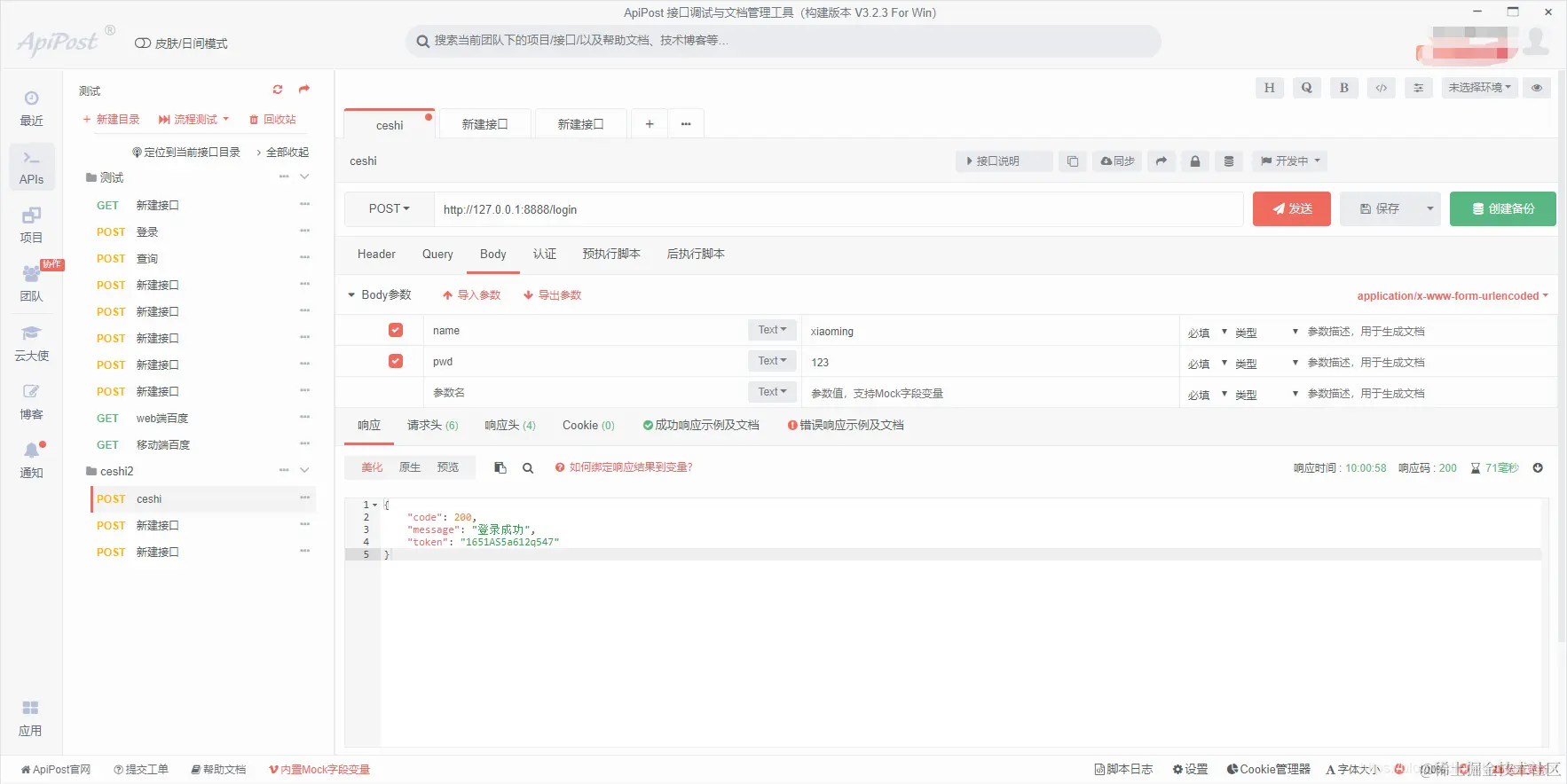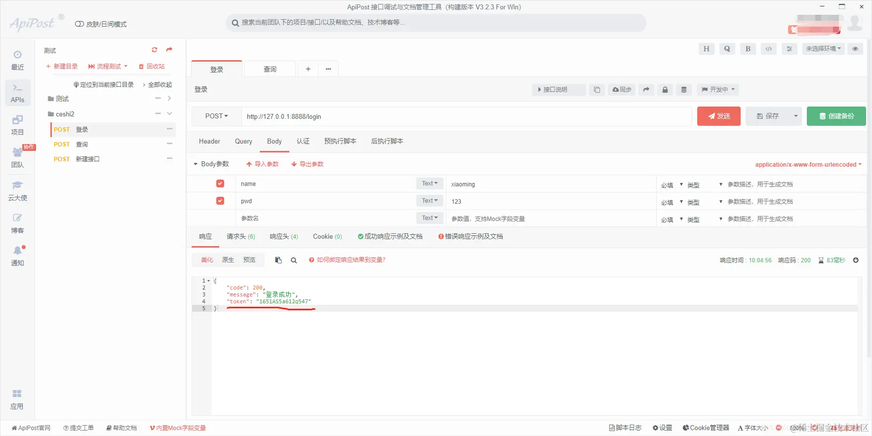 3、使用apipost进行登录接口测试