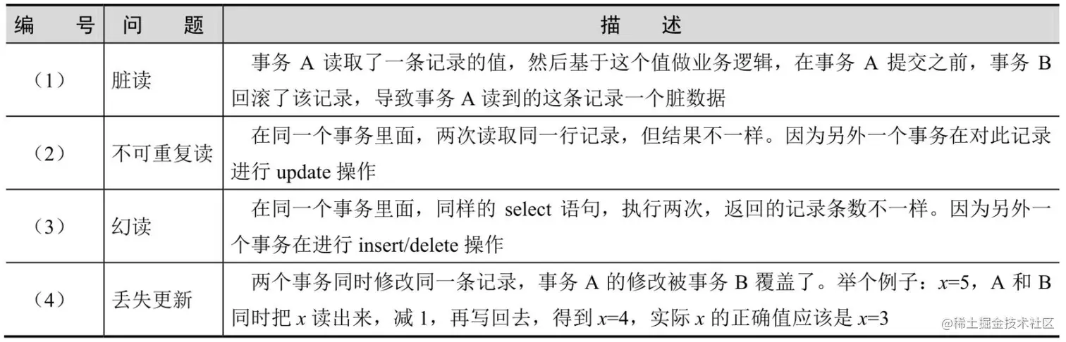 - 丢失更新:两个事务同时修改同一条记录,其中一个被另一个的结果覆盖。这需要开发者手动加锁解决。