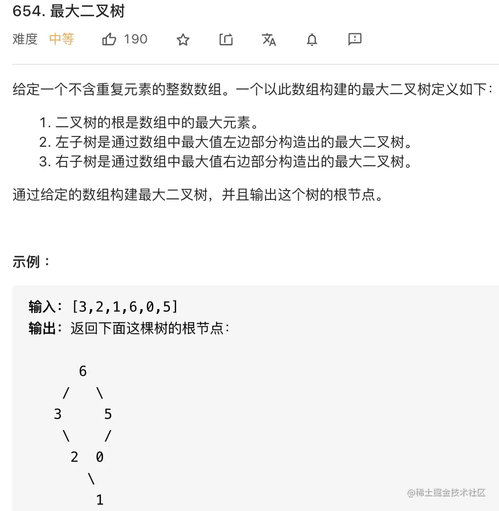 先来道简单的,这是力扣第 654 题,题目如下: