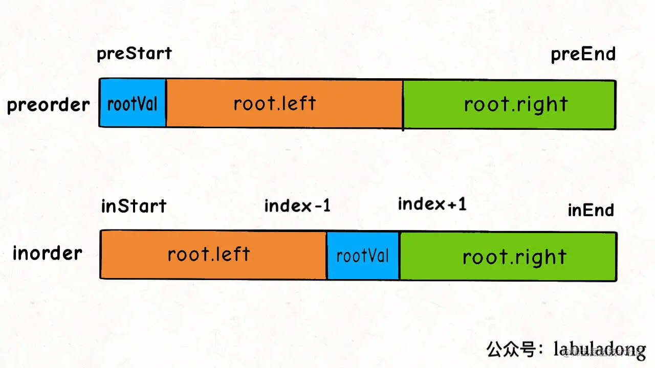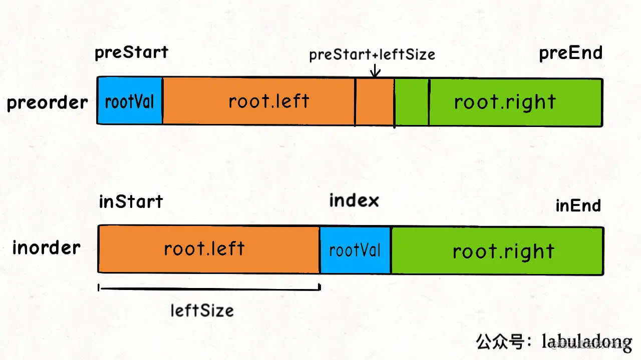 前文 二叉树就那几个框架 写过,这样的遍历顺序差异,导致了 preorder 和 inorder 数组中的元素分布有如下特点: