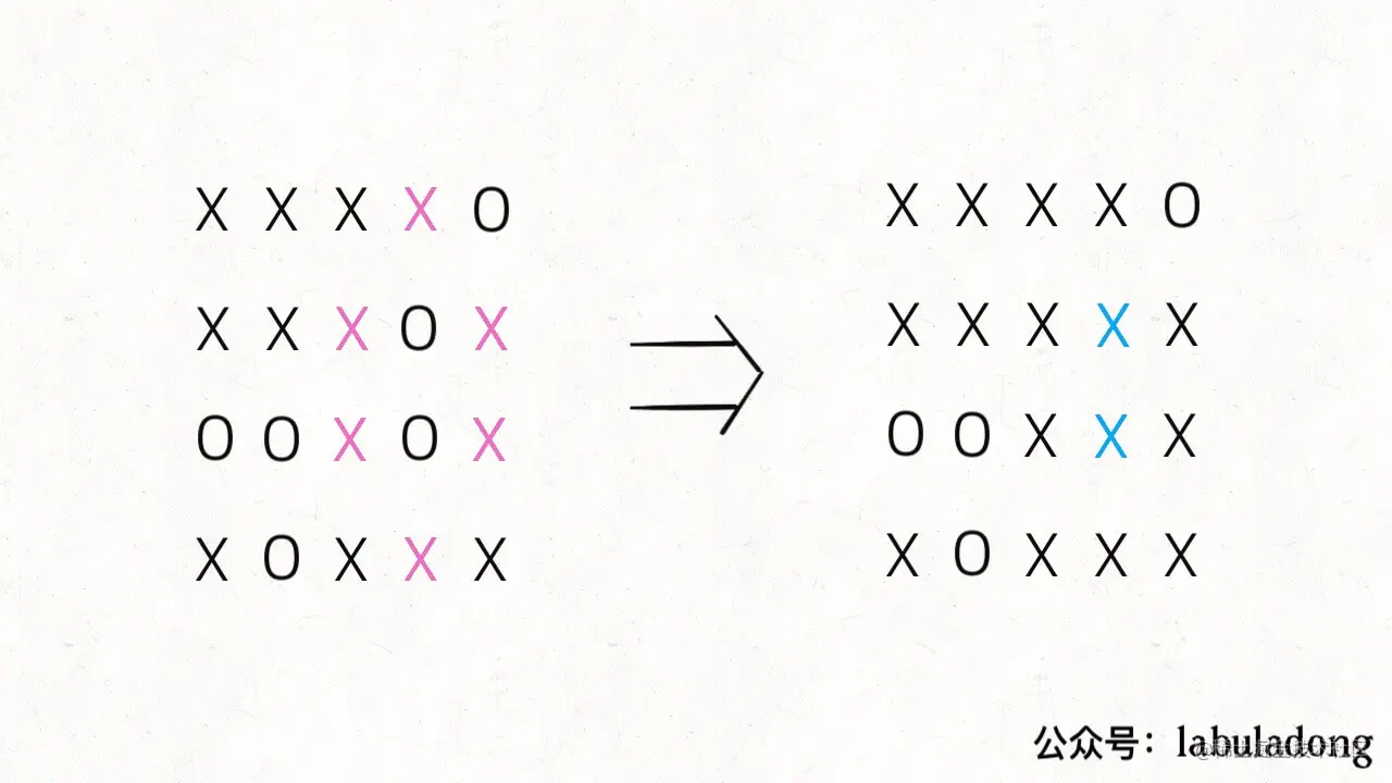 比如第 130 题,被围绕的区域:给你一个 M×N 的二维矩阵,其中包含字符 X 和 O,让你找到矩阵中四面被 X 围住的 O,并且把它们替换成 X。