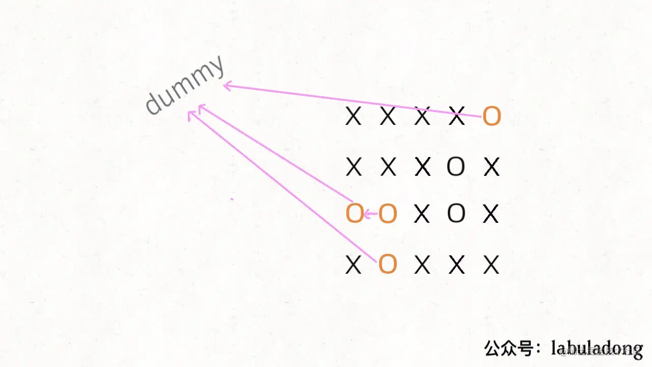 你可以把那些不需要被替换的 O 看成一个拥有独门绝技的门派,它们有一个共同祖师爷叫 dummy,这些 O 和 dummy 互相连通,而那些需要被替换的 O 与 dummy 不连通。