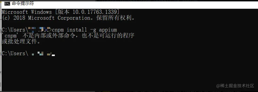 安装appium,执行:cnpm install -g appium,命令后出现:cnpm不是内部或外部命令,也不是可运行的程序,见下图: