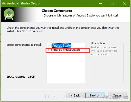 下载Android Studio完成开始安装,如果需要安装自带的模拟器,就把这一项勾选上,然后Next(若是需要使用模拟器运行,建议勾选第二项)