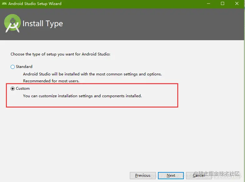 注意:接下来一路Next,到了选择SDK的页面注意一下选择Custom,这样可以只安装自己喜欢的部分,接下来选择主题,当然这个以后可以在Android Studio里边改